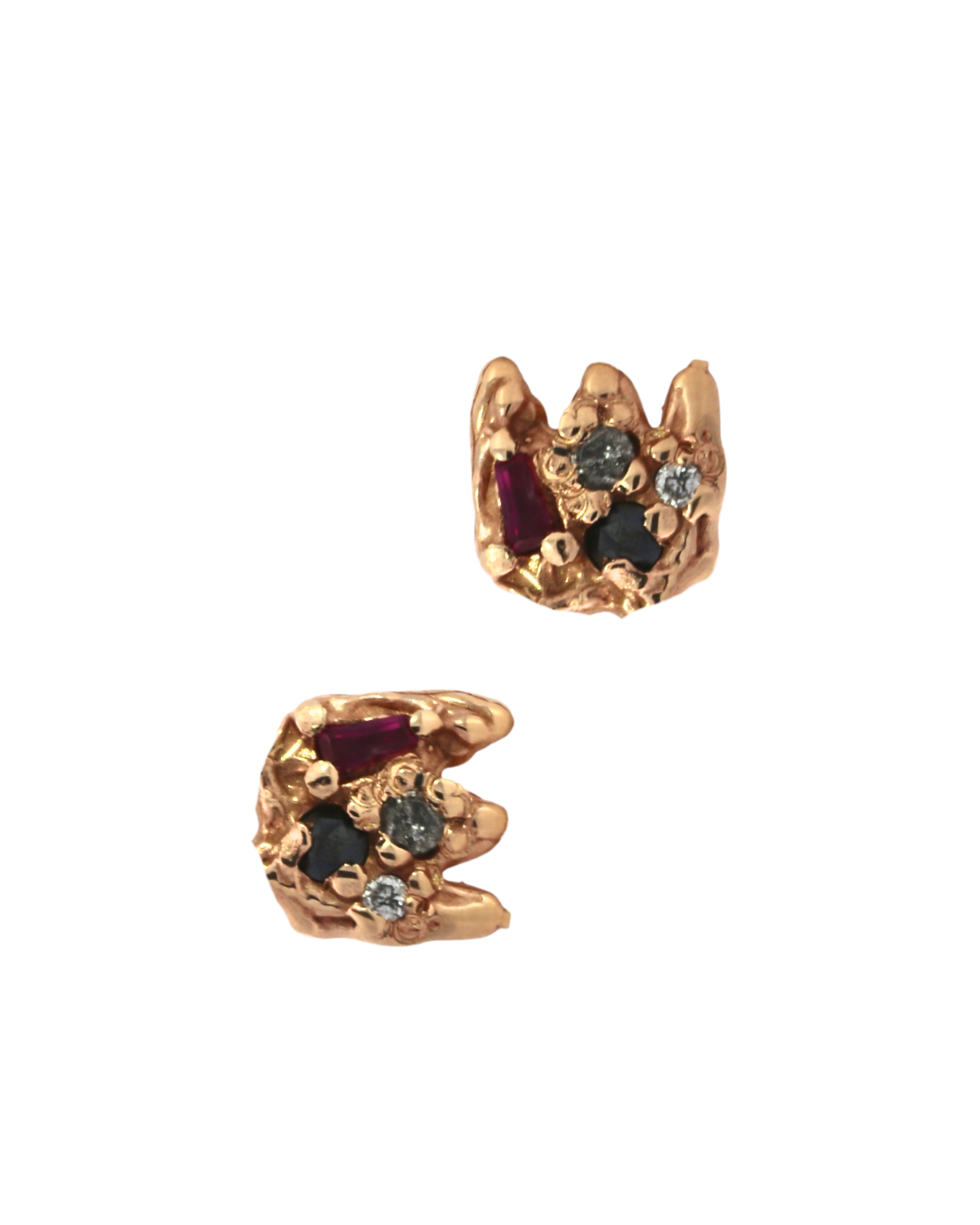 Crown stud earring with embedded diamonds and rubies. For custom stone options please email siri@sirihansdotter.com
