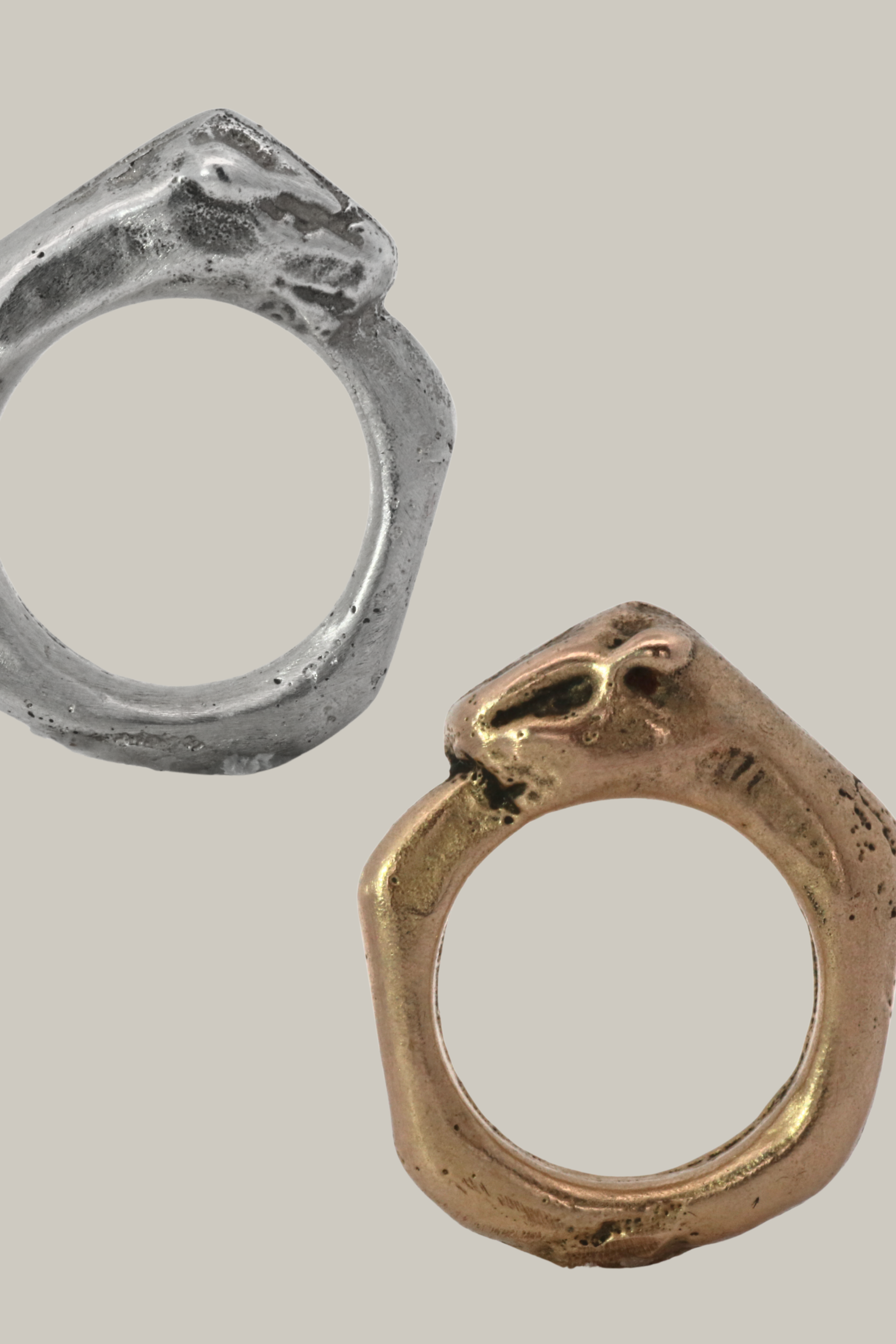 This collection of sand cast statement rings embraces the weight of metal and is solid sterling silver weighing approximately 17 grams. These rings are weighty and playful wearable sculptures, raw and unrefined, yet polished enough to evoke the coveted patina of time.