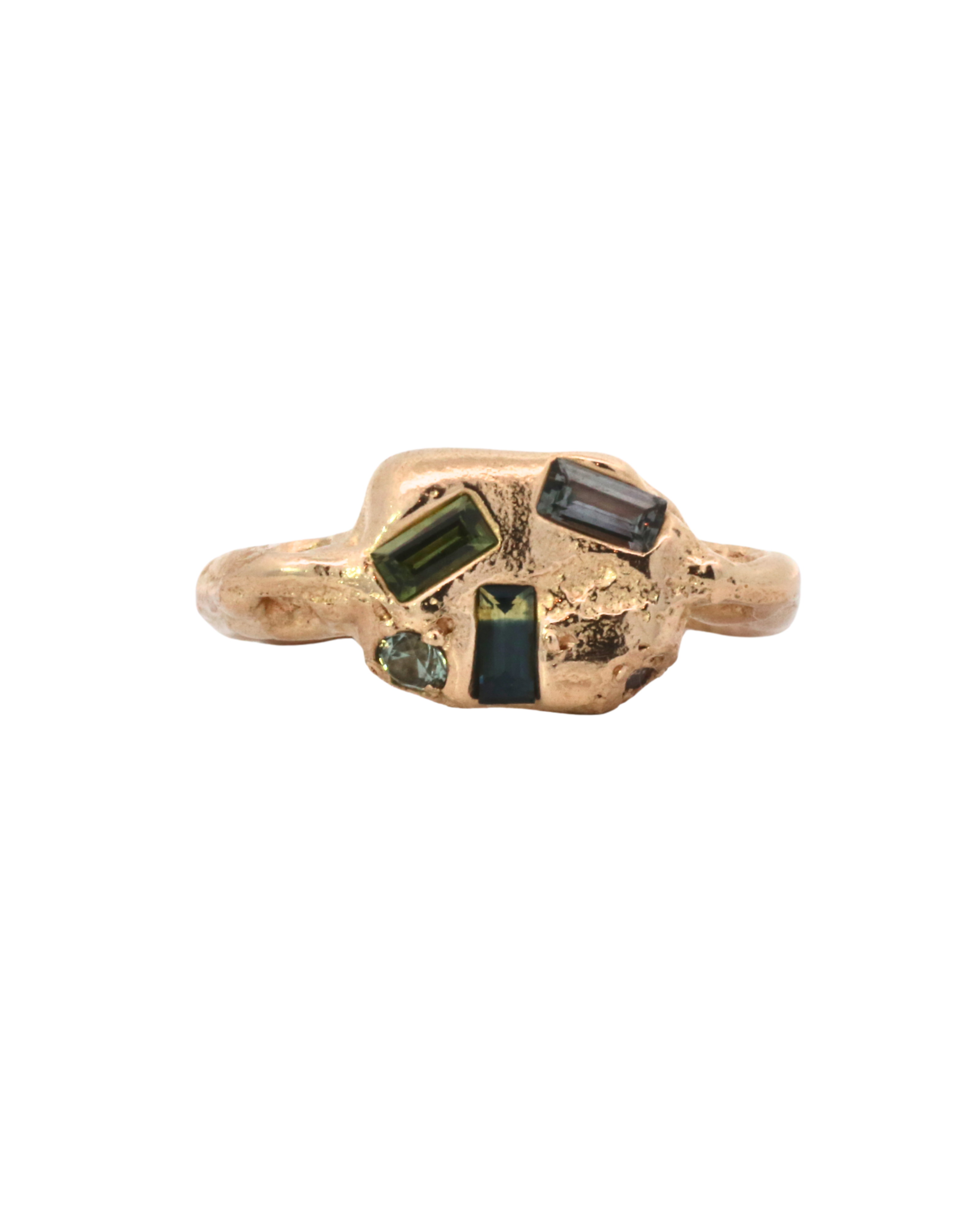 Seb has moves, round and square and shaped like an ancient vessel, because we pour it on thick. Because, not dainty. A ring designed for pinky, self love and expression - sand casted with substance, stones in place, no two are completely alike.