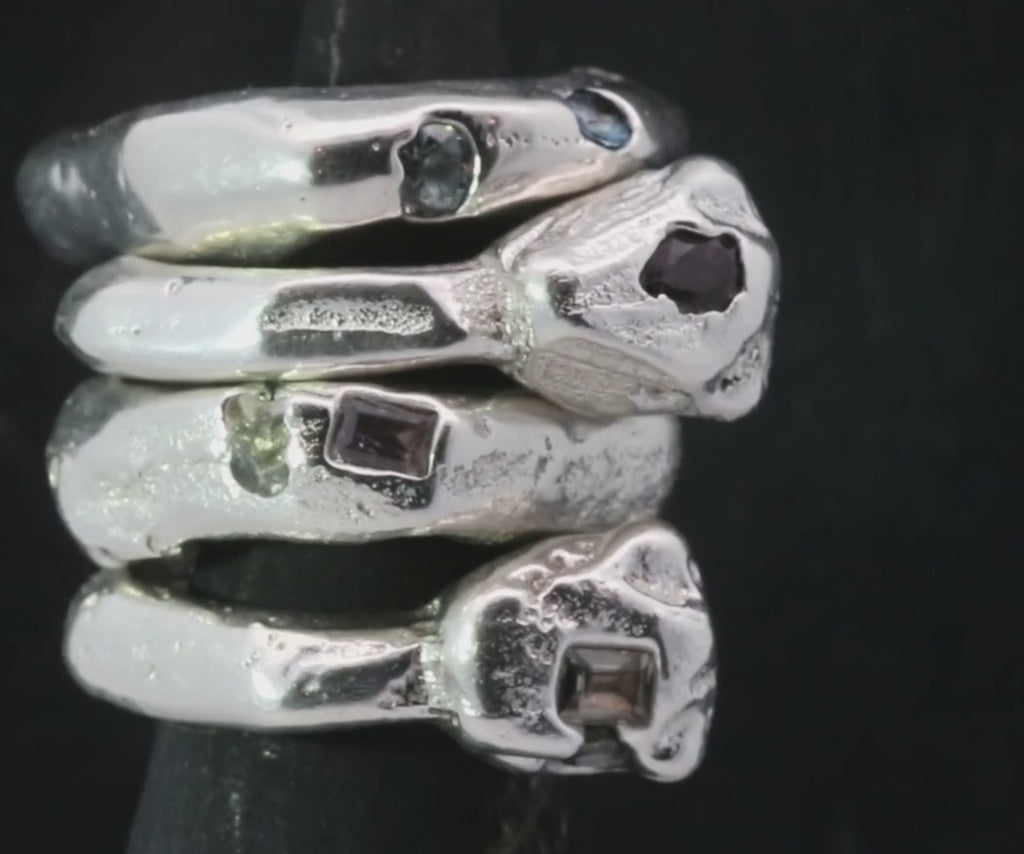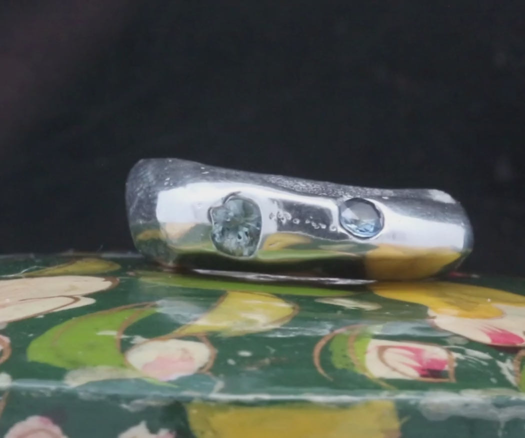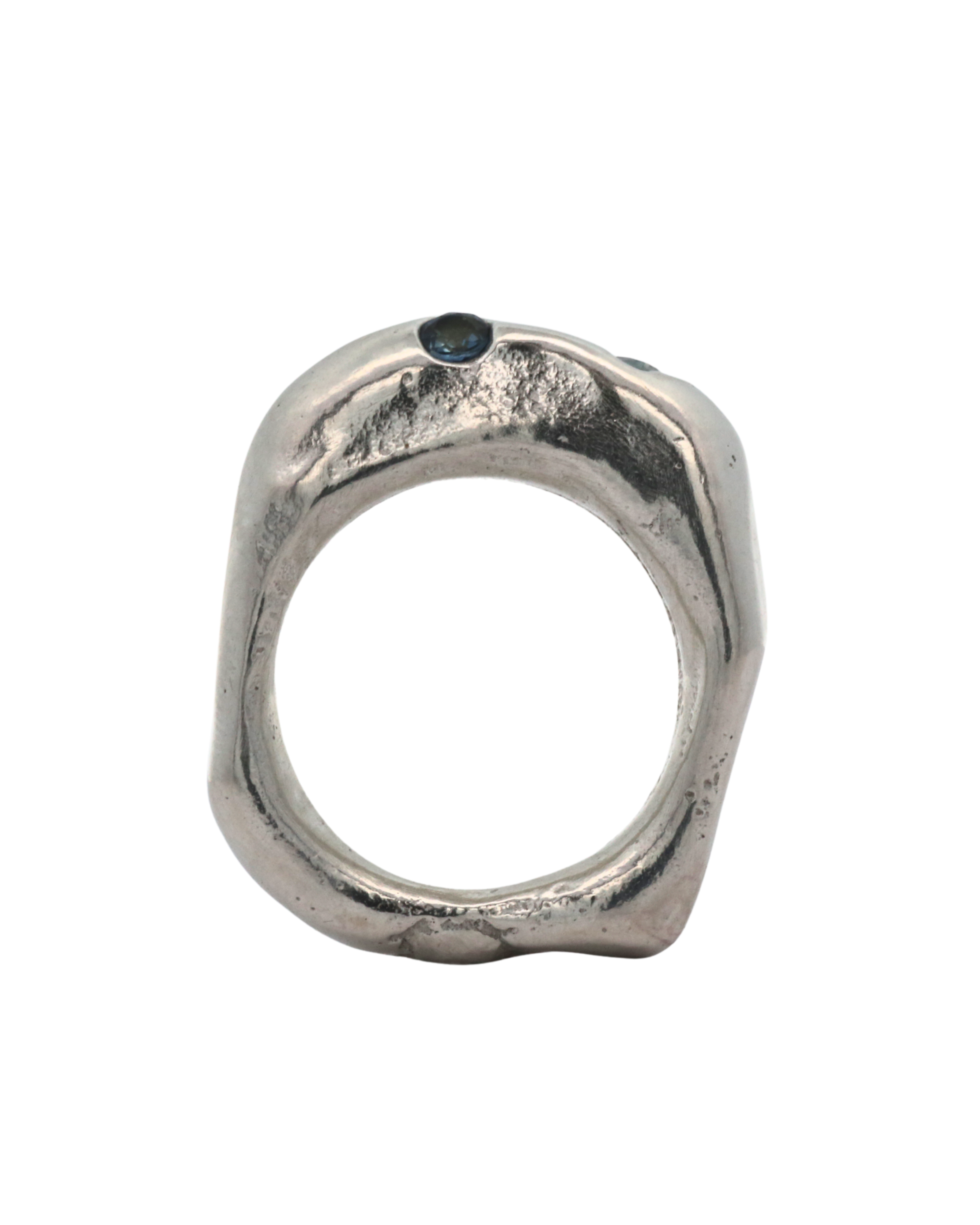 The Seebe is a weighty silver sculpture, This one has two embedded sapphires in shades of divine lavender blue.