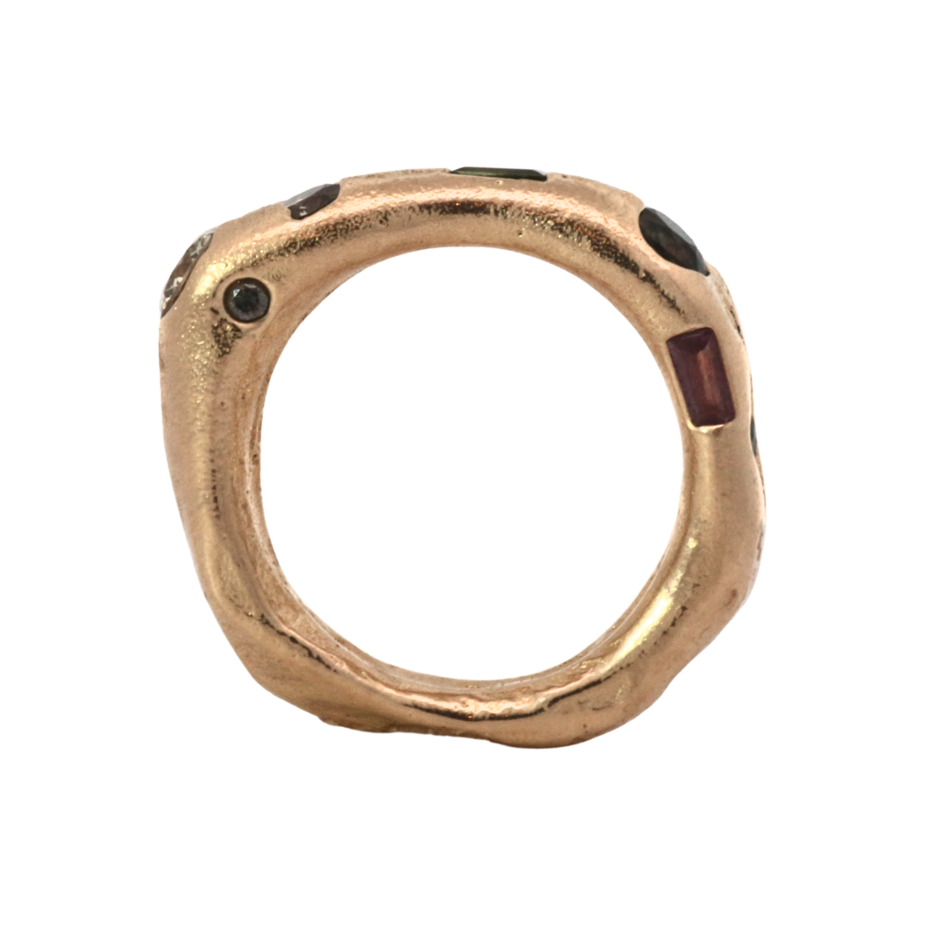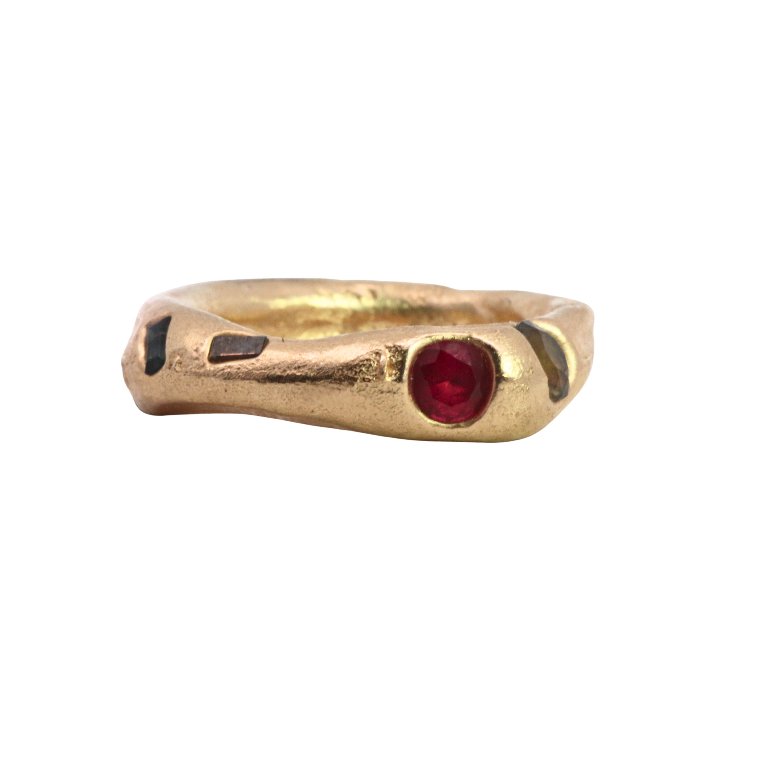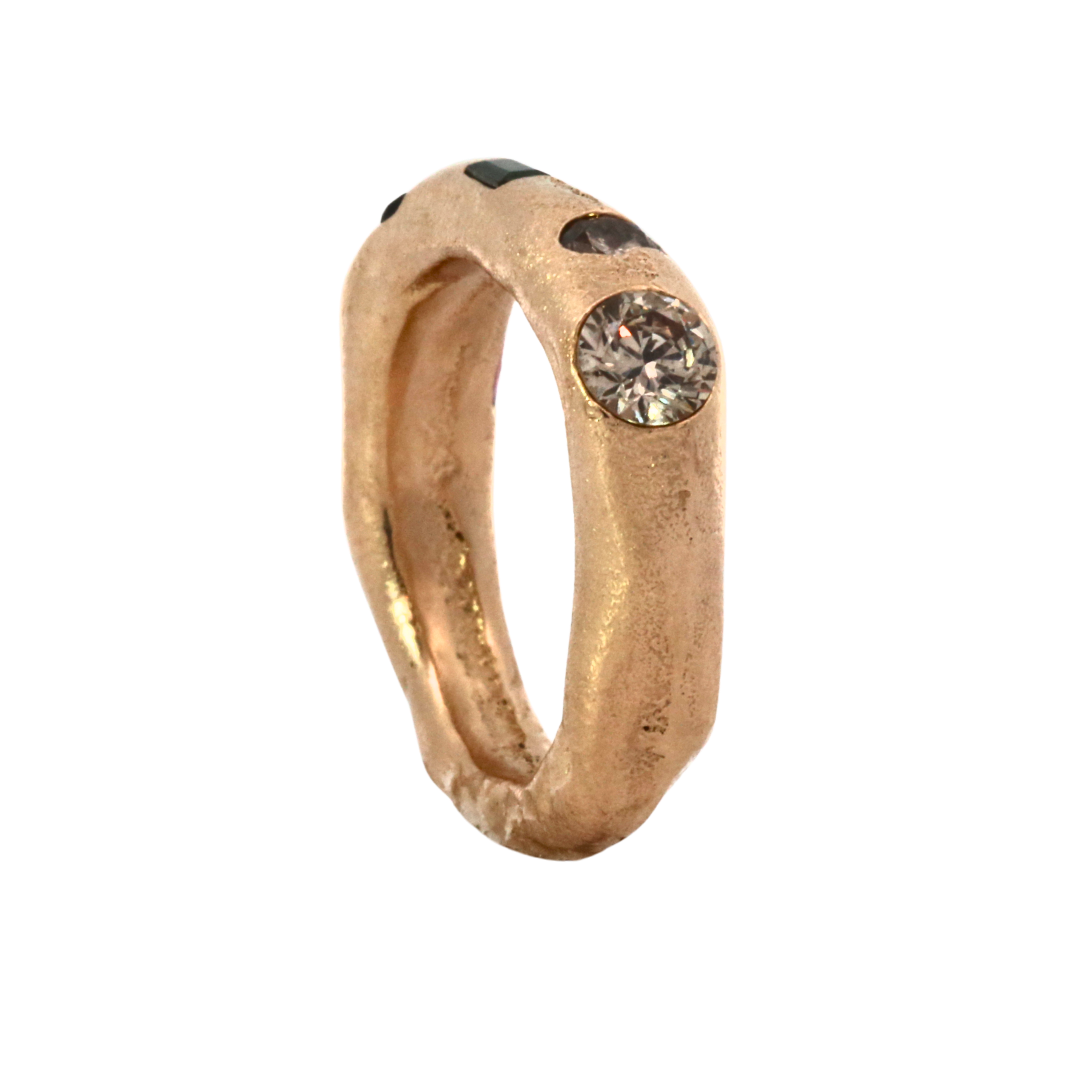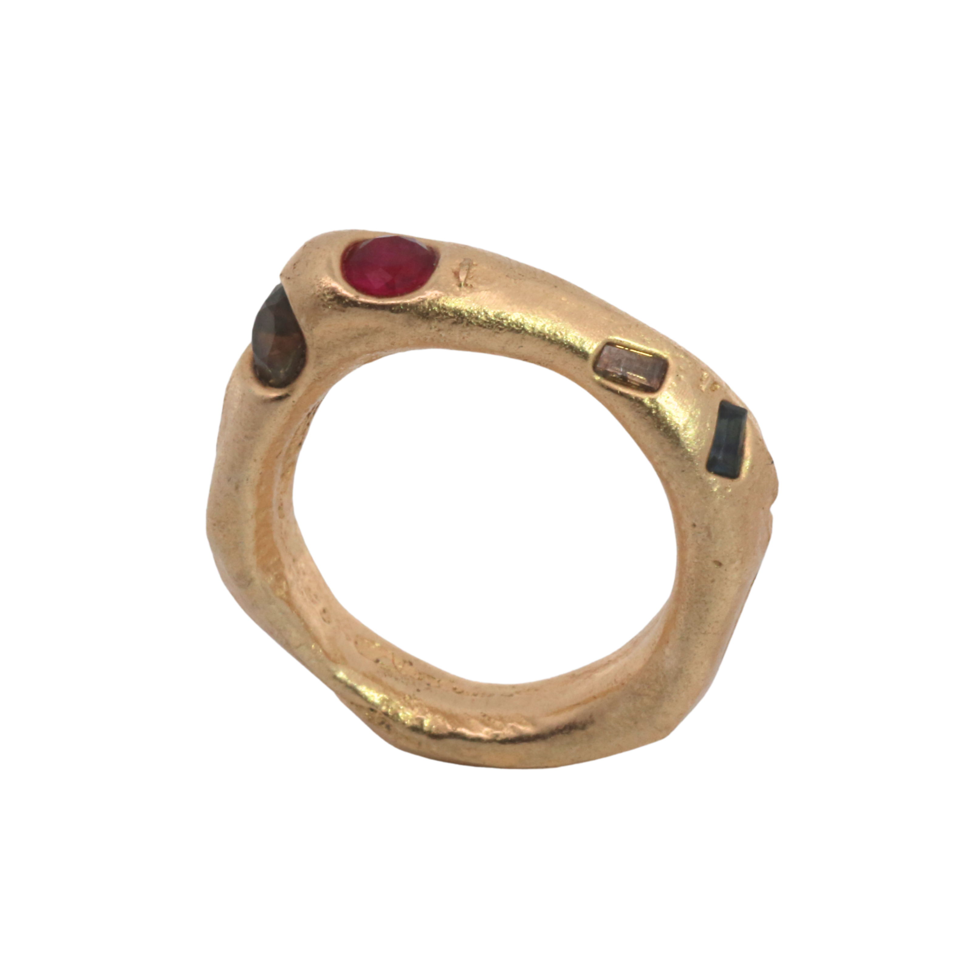 Jewelry cast in sand, an ancient technique involving two parts. The stones are placed directly in the sand and the molten metal is poured, embedding thge sapphires, diamonds and rubies in place. Each is absurdly unique and so, one of a kind.
