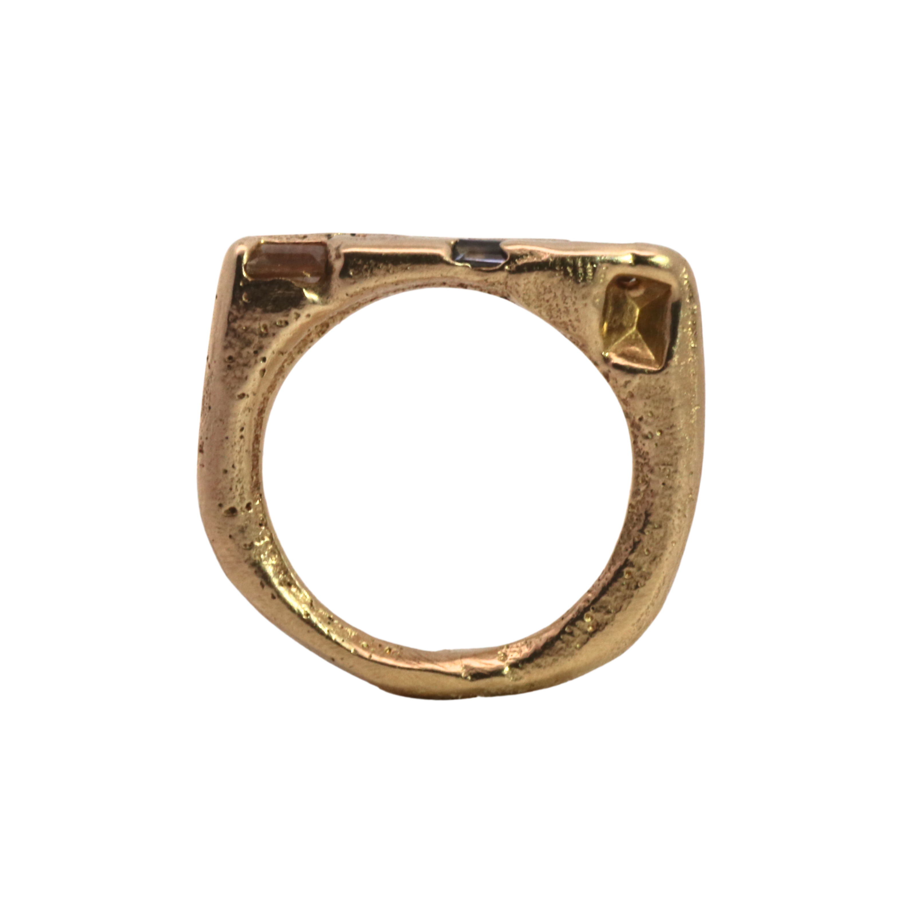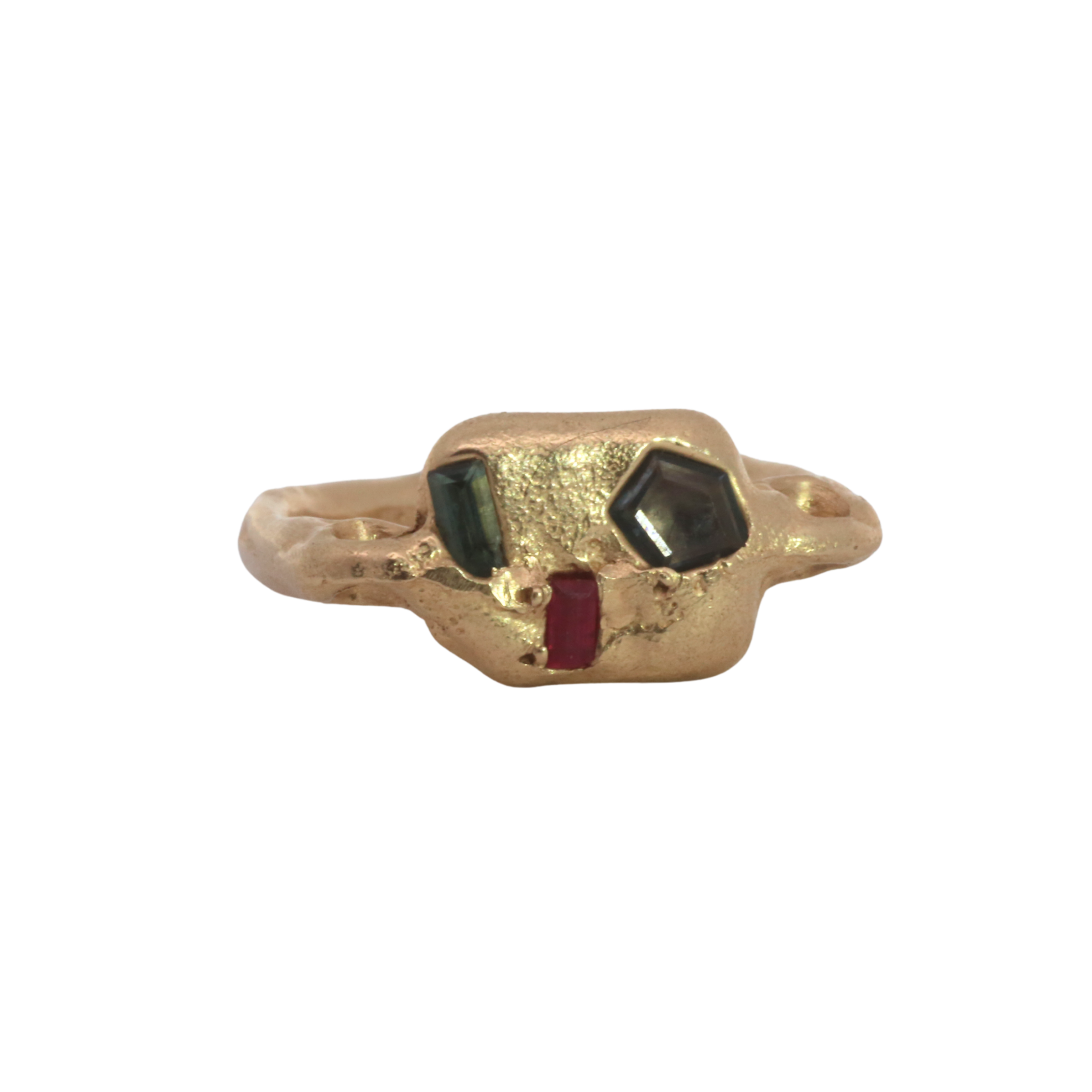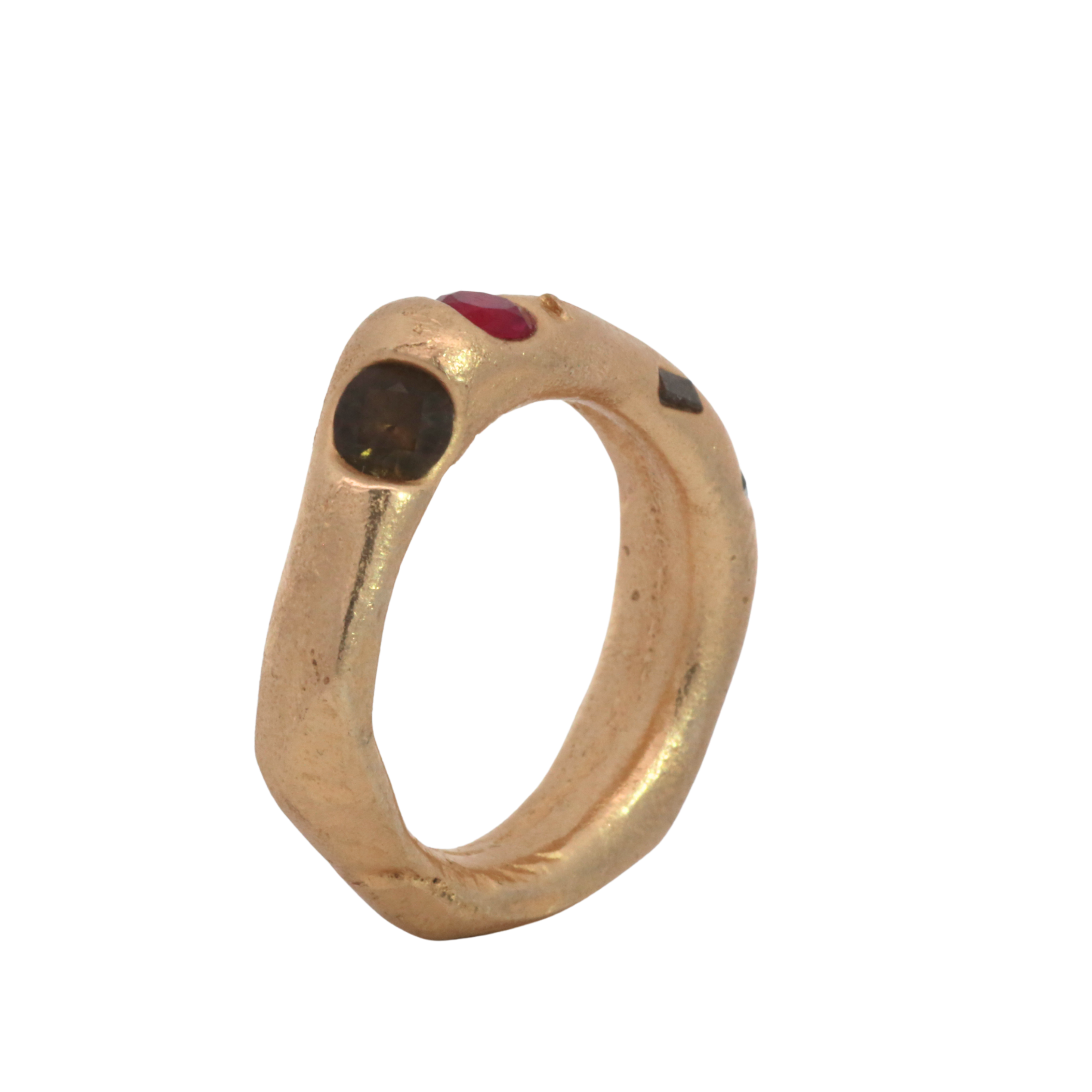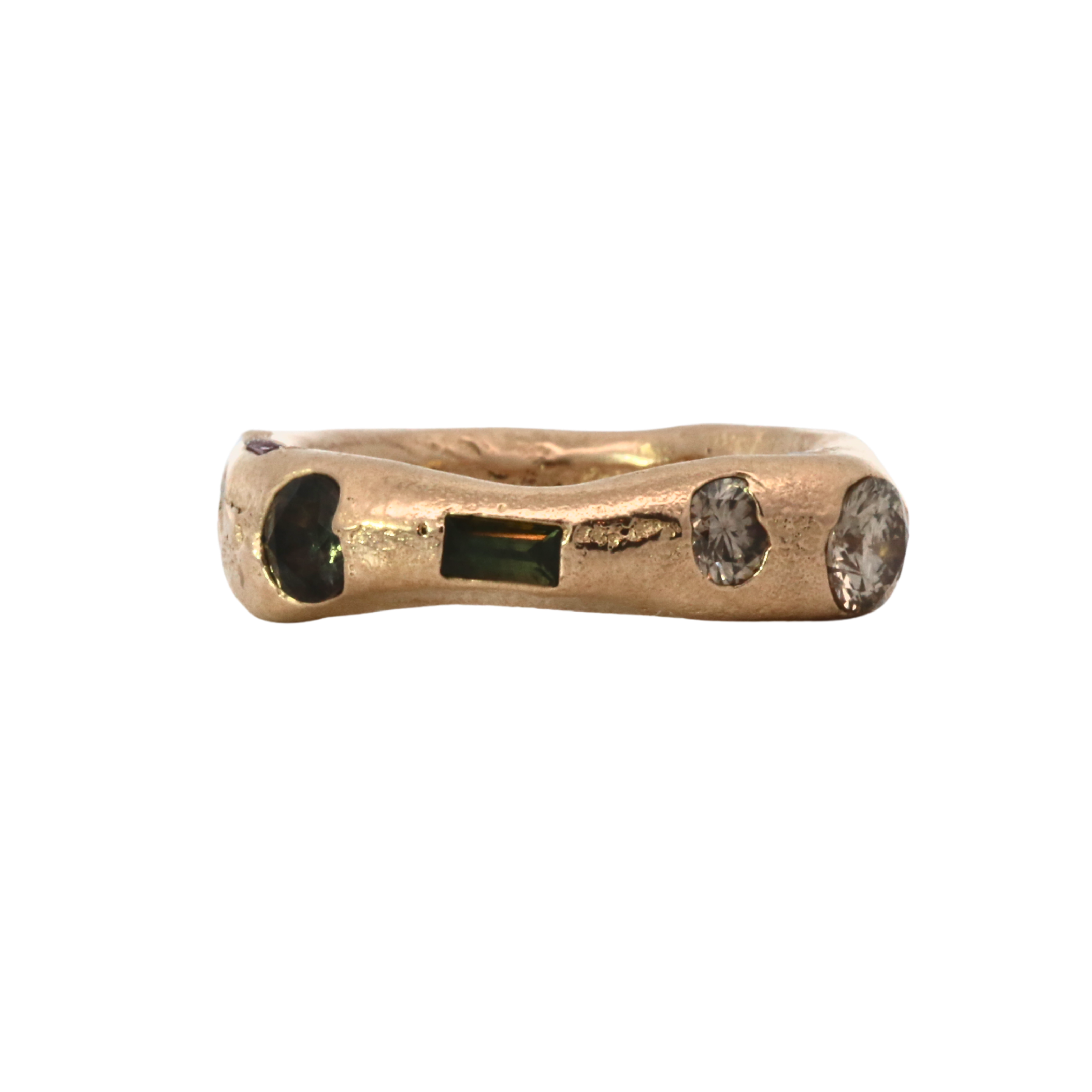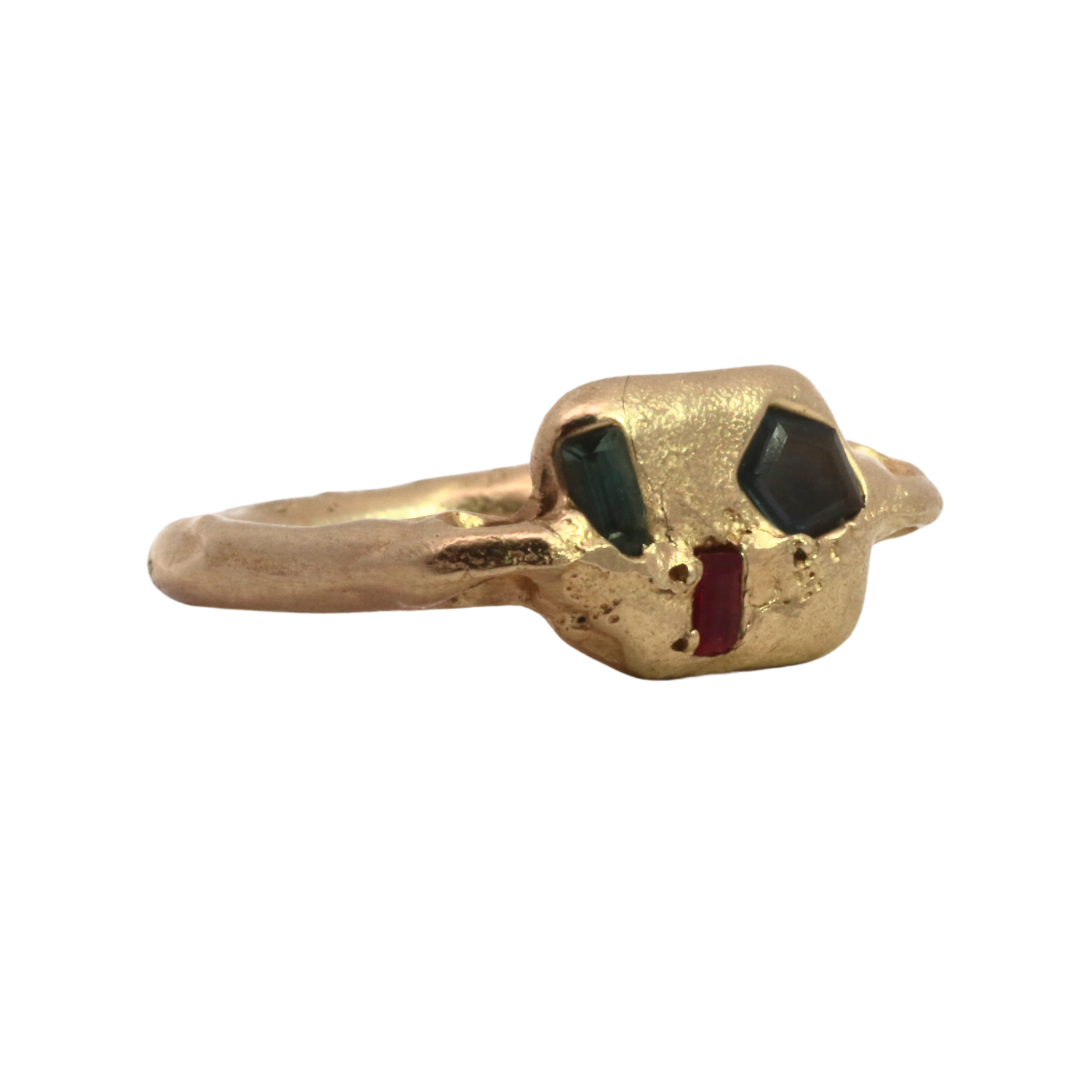 Jewelry cast in sand, an ancient technique involving two parts. The stones are placed directly in the sand and the molten metal is poured, embedding thge sapphires, diamonds and rubies in place. Each is absurdly unique and so, one of a kind.