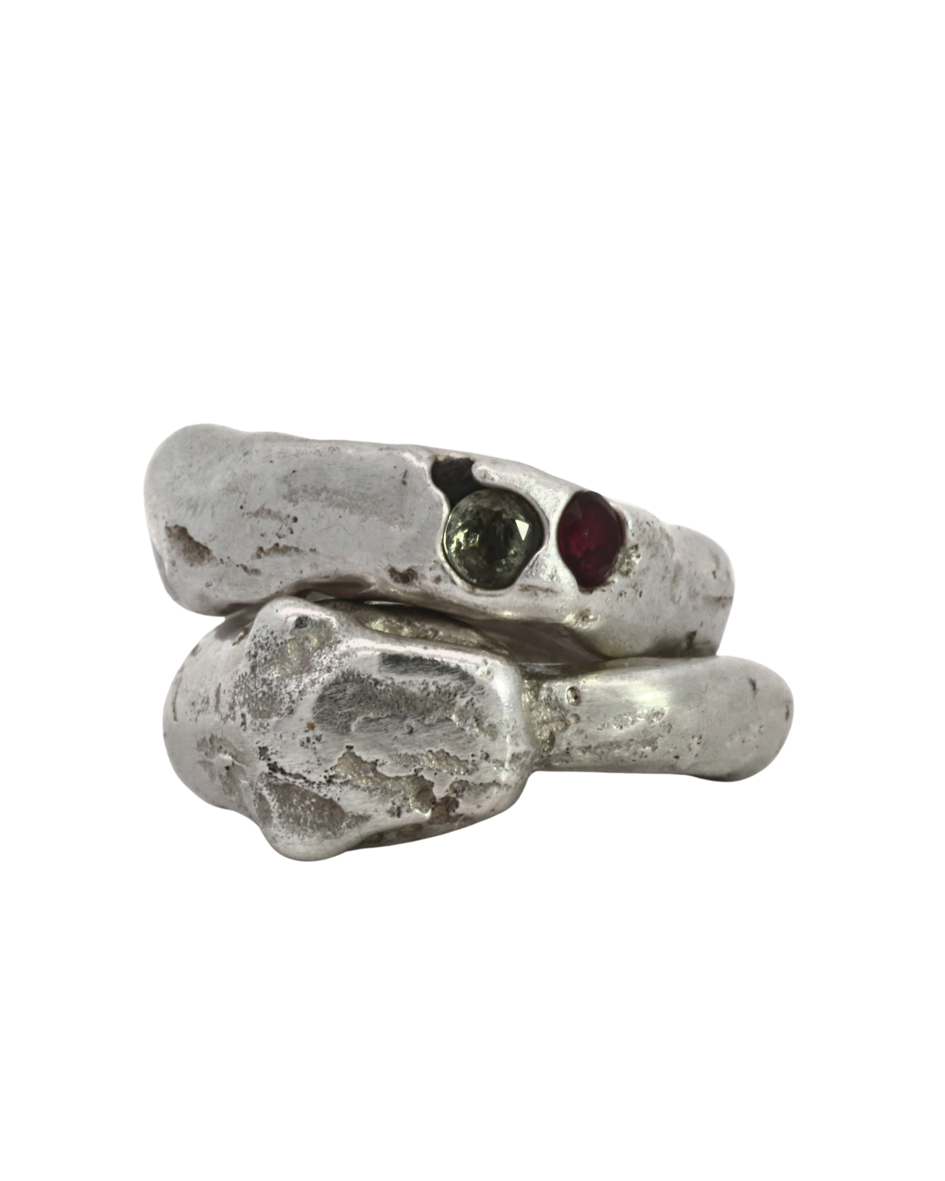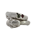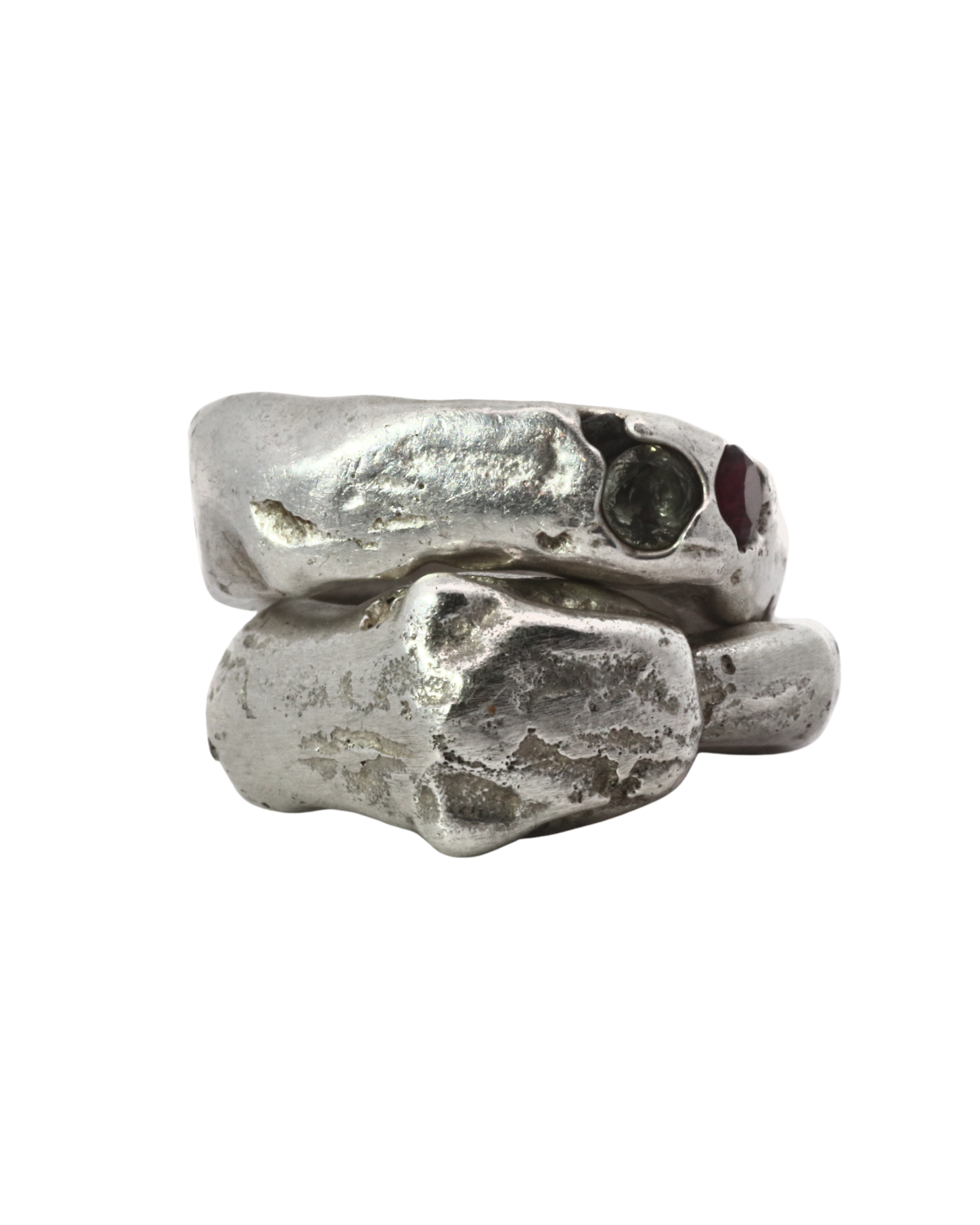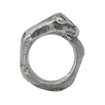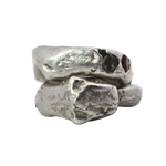 This collection of sand cast statement rings embraces the weight of metal and is solid sterling silver weighing approximately 17 grams. These rings are weighty and playful wearable sculptures, raw and unrefined, yet polished enough to evoke the coveted patina of time.
