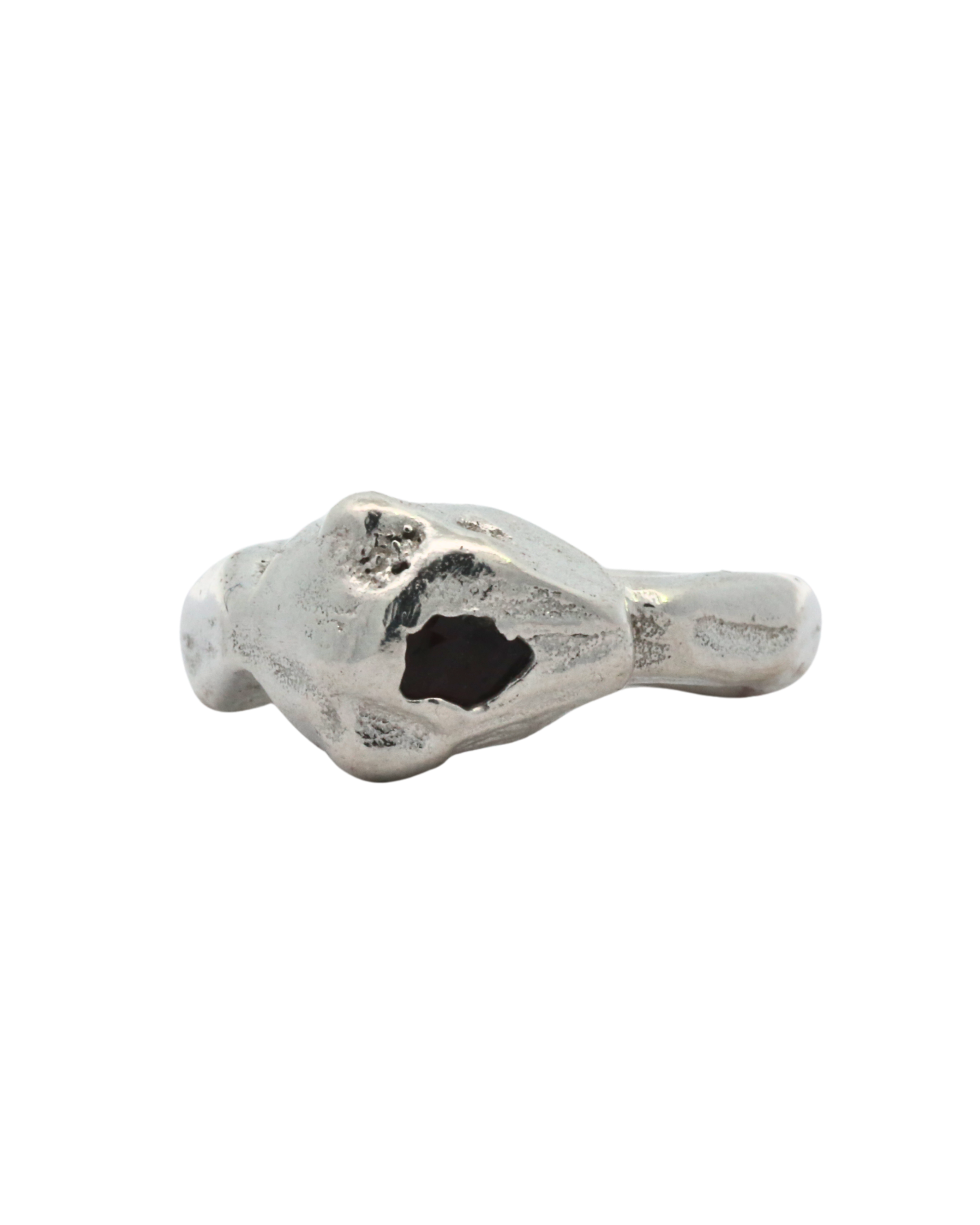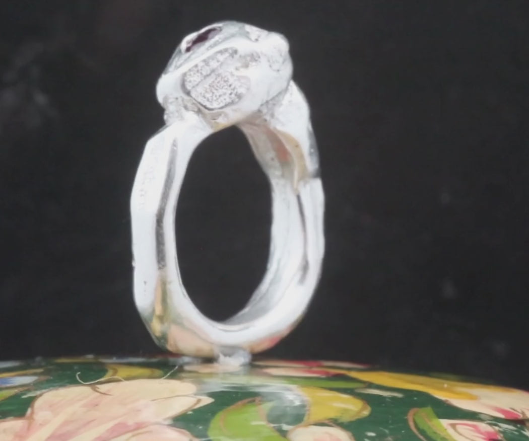 Big statement ring carved and in wax and sand cast in recycled stering silver with pear shaped ruby embedded at the crown of a tapered wild cat head.