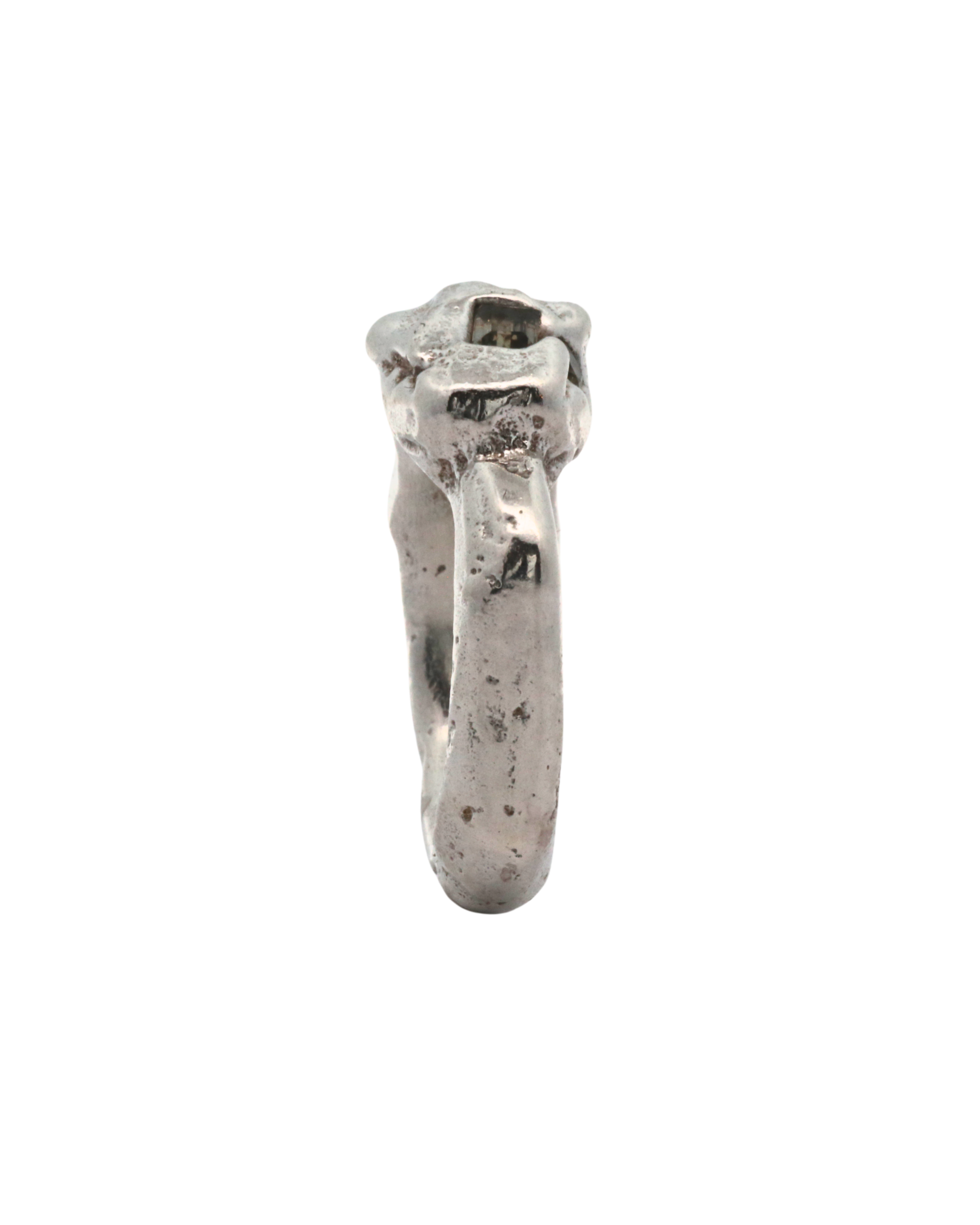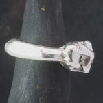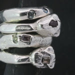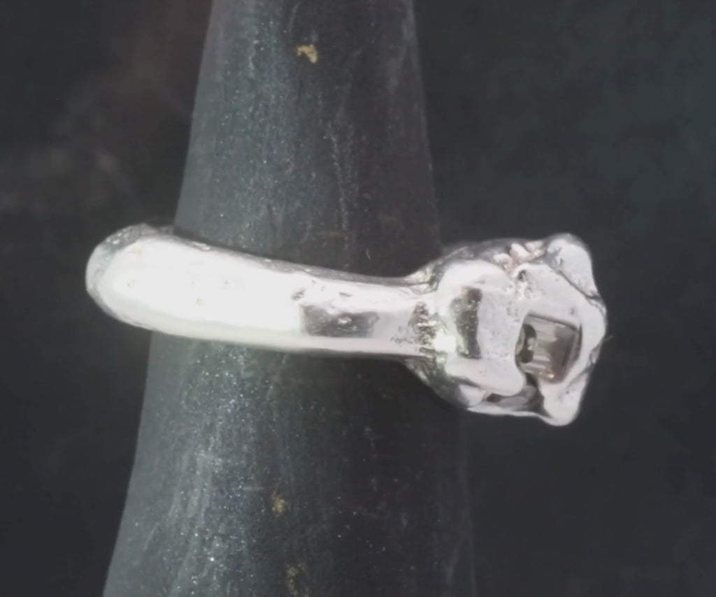 This collection of sand cast statement rings embraces the weight of metal and is solid sterling silver weighing approximately 17 grams. These rings are weighty and playful wearable sculptures, raw and unrefined, yet polished enough to evoke the coveted patina of time.