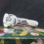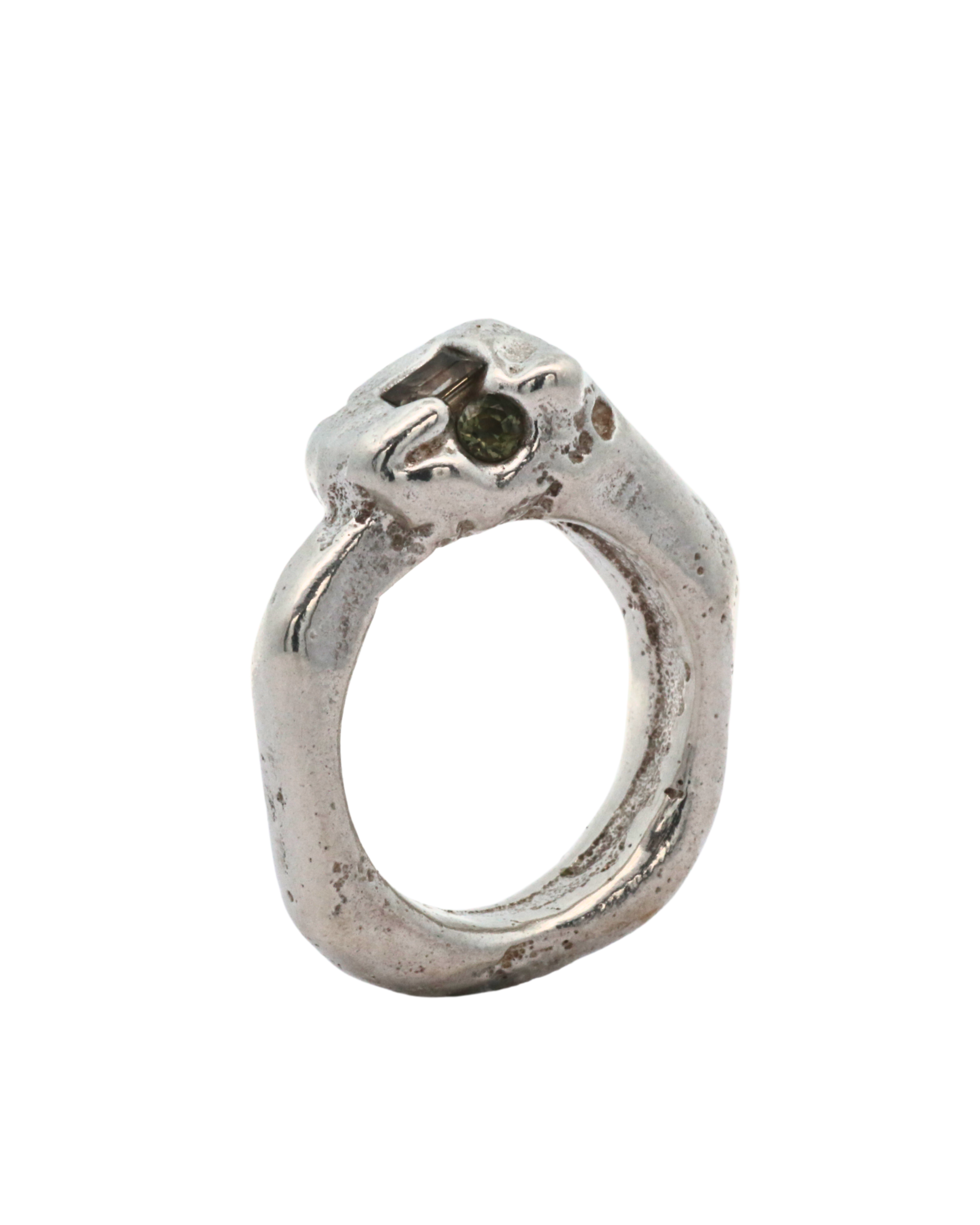 Big statement ring hand carved and in wax and sand cast in recycled sterling silver with Pale green sapphire baguette embedded at the crown nestled next to a cornflower blue sapphire eye.