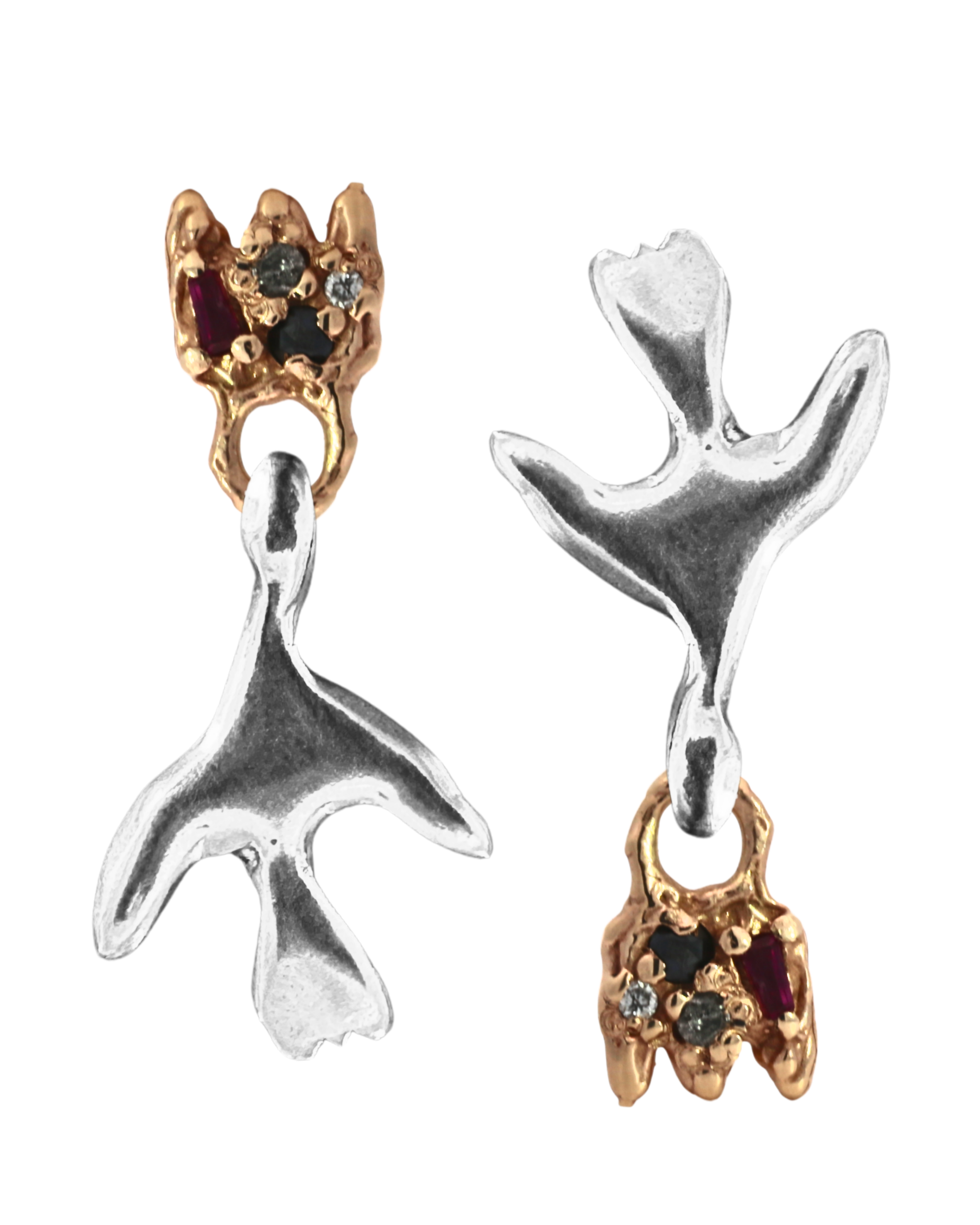 Hand carved three pointed crown with diamond and ruby pavé. Cast in 14K Fairmined gold with sterling silver doves - one flies up and one flies down.